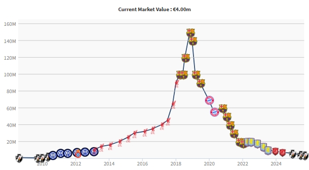 库蒂尼奥也曾是货真价实的亿元先生,他在2018年以1.35亿欧转会费从利物浦加盟巴萨。库蒂尼奥效力巴萨后巅峰期 身价曾一度高达1.5亿欧,但随后他的身价一降再降。“酷鸟”这些年接连效力拜仁、维拉、杜海勒和瓦斯科达迦马,篮球快讯均没能展现巅峰期 实力。