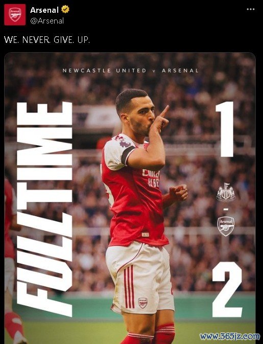 阿森纳社媒赛后热血 发文:“我们永不放弃!”
