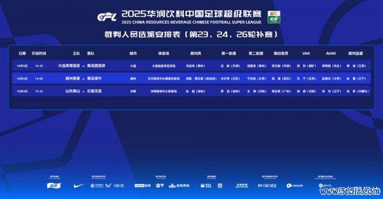 10月4日讯 今晚中超职业联赛 将进行第23轮、第24轮和第26轮的三场补赛。赛事 开始前,中国足协公布了这三场赛事 的裁判 安排。