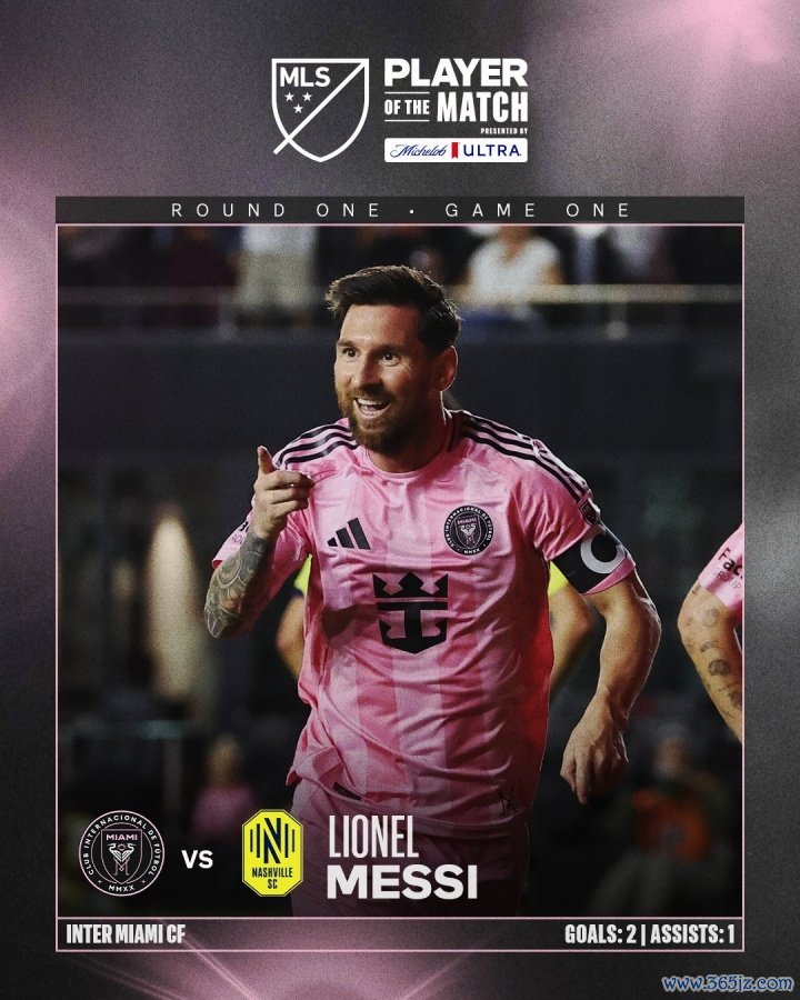 10月25日讯 美职联季后赛首场,梅西连进两球,迈阿密3-1纳什维尔。美职联官方宣布梅西当选全场最佳球员。