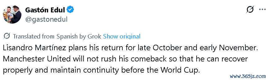 据悉,如果利马10月份回归,将是一个「惊喜」,但球迷更可能不得不等到更久。「曼联一直不愿就此事透露任何信息,尽管夏天的时候我被告知这位阿根廷后卫还需要『几个月』的时间才能复出。一般来说,十字韧带损伤的恢复期为8个月,也就是到10月初。」斯通解释道,「阿莫林对于何时让球员从伤病中恢复是出了名的谨慎,他有卢克·肖和18岁小将海文可以出任左中卫的位置,这也暗示着利马回归一线队还需要时间。」