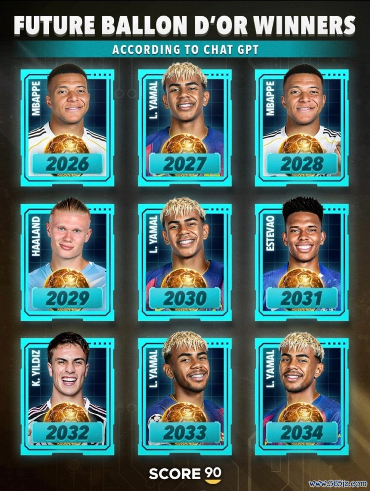 9月24日讯 Score90列出ChatGPT对未来几年金球奖获奖者名单,其中9年中亚马尔占4席, 乒乓球西甲直播具体如下: