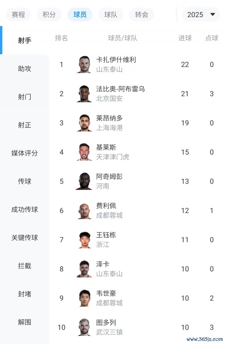 榜首的泰山外援卡扎伊什维利本轮比赛未赛,同时0个点球。