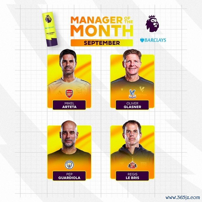 10月2日讯 英超公布9月份最佳教练候选名单,阿尔特塔、格拉斯纳、瓜迪奥拉和勒-布里斯入围。