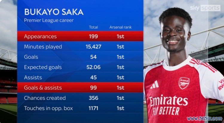 10月4日讯 萨卡将迎来英超出战200场里程碑,天空体育统计了萨卡首秀以来的英超数据,篮球快讯高清直播他的出场次数、进球、助攻等多项数据阿森纳队内同期居首。