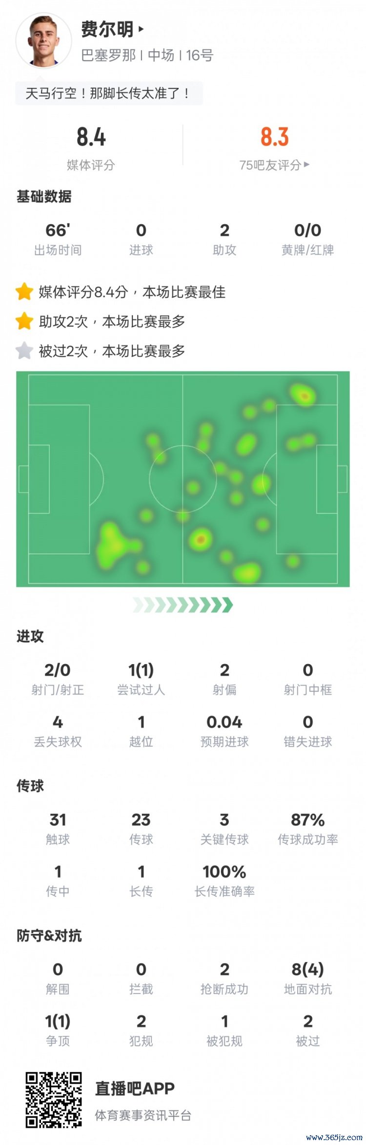 费尔明本场比赛数据: