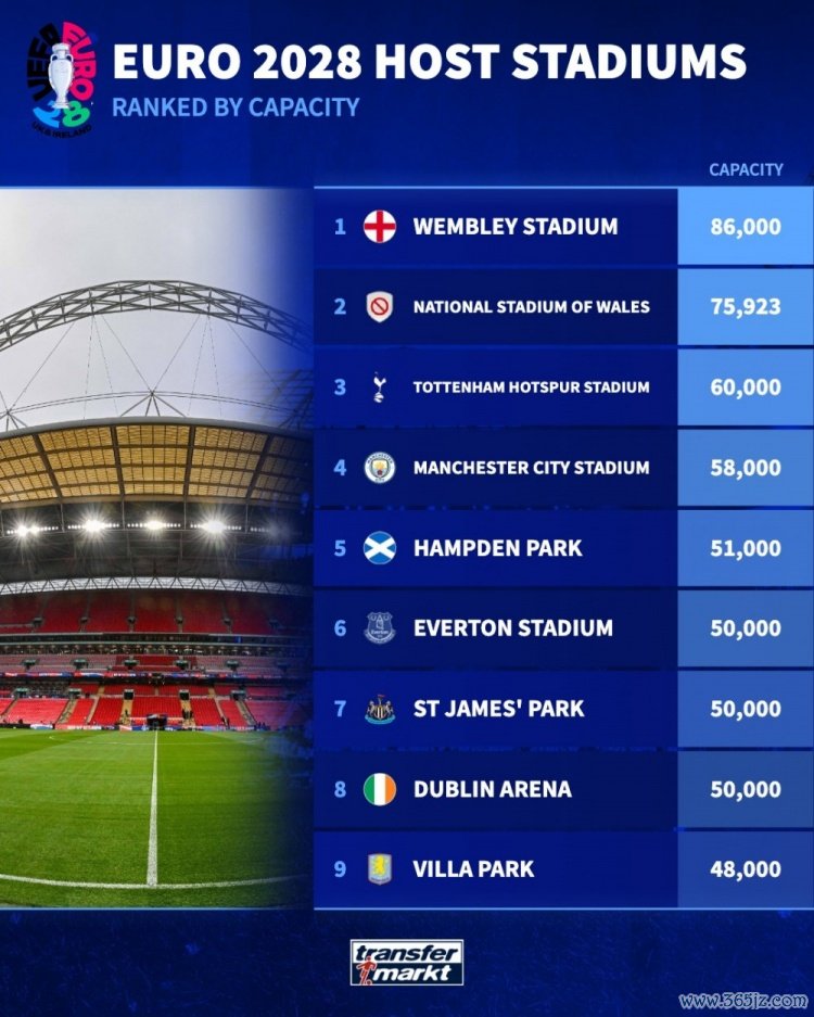 11月13日讯 2028年欧洲杯承办球场公布,篮球快讯在线直播德国转会市场列出了各球场容量排名。